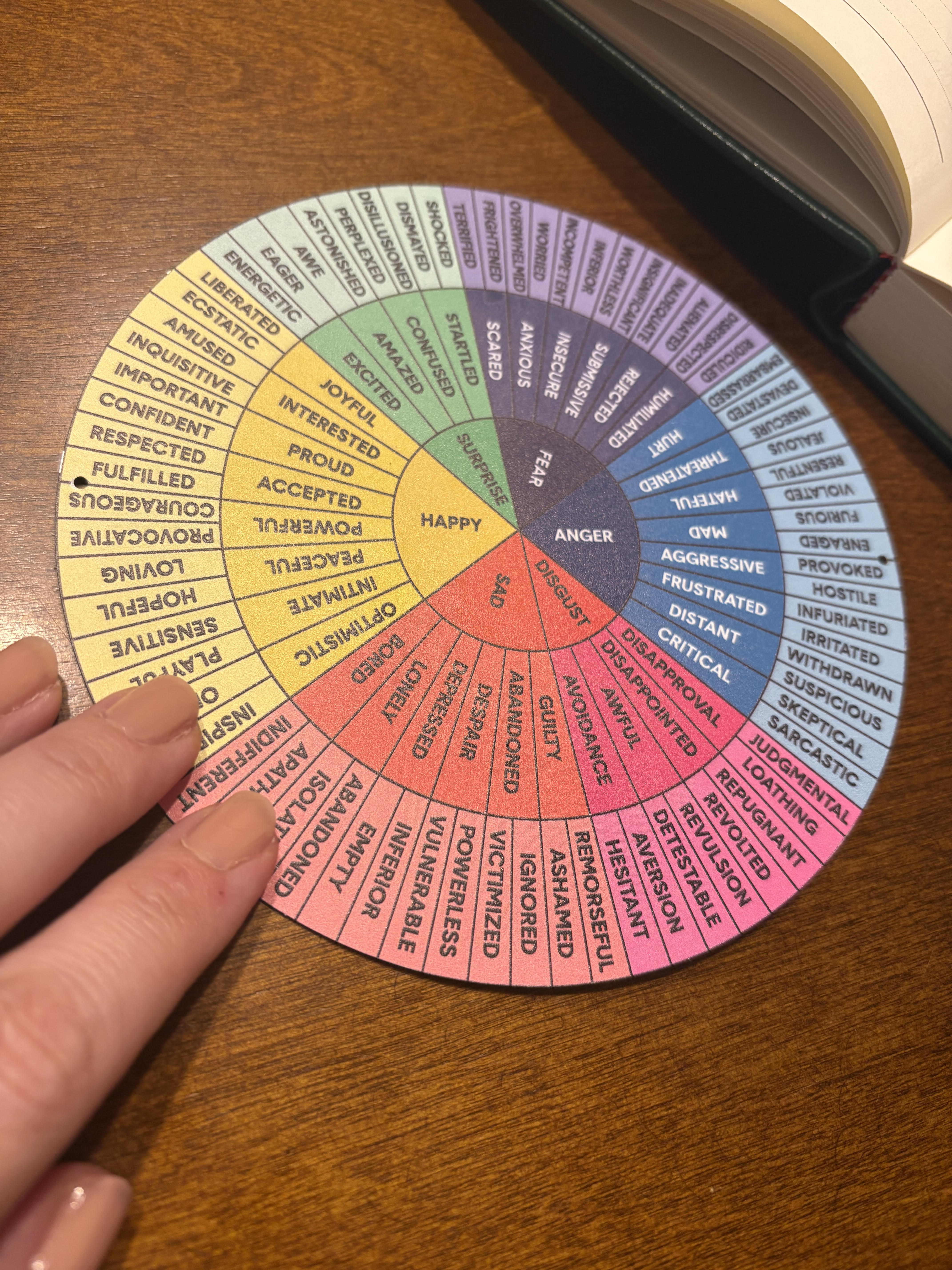 Back to my journal and the first 1 in the 51515. I write “How I feel” and challenge myself to write 1-2 descriptors for my day. What 1-2 feelings am I experiencing in this moment or did I experience earlier in the day? This prompts me throughout the day to check in with myself and ask “how AM I feeling right now?” knowing that I have a space to be accountable for that during my quiet time. I bought a feelings wheel that I keep handy that helps me navigate emotional language so I can move beyond mad, sad & glad into more genuine, nuanced feelings that are more true and more accurate. I’m learning to question when I feel anger at the surface, is that really what this is that I am experiencing in my body? Connecting my emotions to my physical self, the sensations I notice in my countenance, continues to be work I embark on.