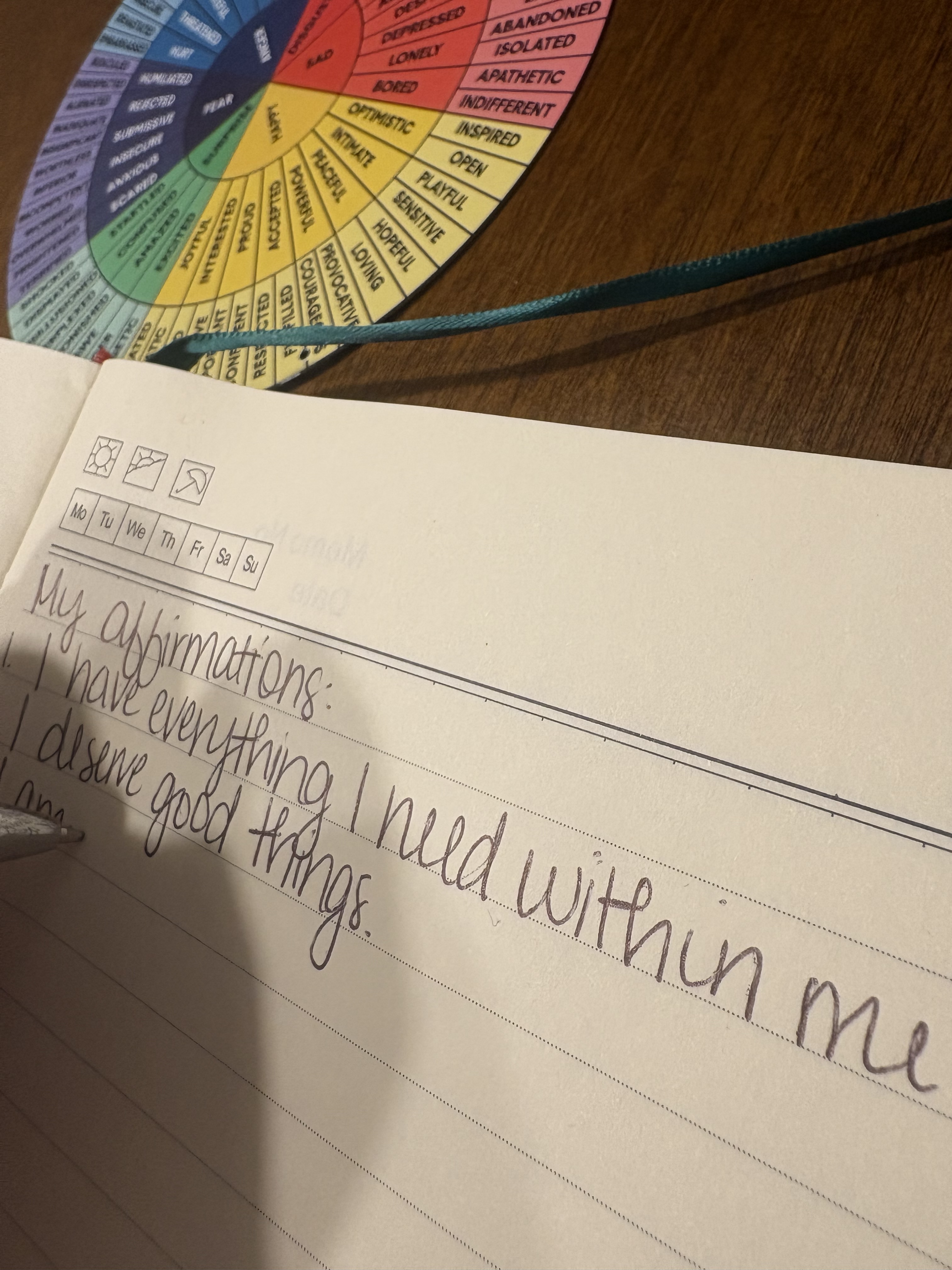 Nothing changes if nothing changes. So, I spent time really thinking about what’s important to me, how I want my life to look in the future. Am I content with life passing as it is or do I want more? Different? So, I think of this section as not so much a destination as maybe a pit stop because who knows where this journey will take me! I write the same 5 goals each day and begin each of them with “I am..” in present tense. Not I will. I AM. I actively demonstrate that I believe they will come to fruition. They are specific and concrete. Attainable but a stretch.